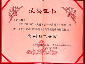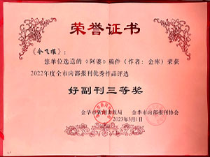 今飞报-选送的《文化浅思——致新春》稿件(作者:徐龙)荣获2022年度全市内部报刊优秀作品评选好新闻三等奖