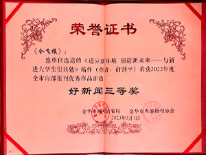 今飞报-选送的《适应新环境 创造新未来——与新近大学生们共勉》稿件(作者:俞剑平)荣获2022年度全市内部报刊优秀作品评选好新闻三等奖