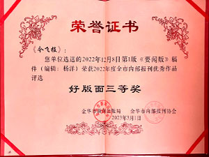 今飞报-选送的2022年12月8日第一版《要闻版》稿件(编辑:杨洋)荣获2022年度全市内部报刊优秀作品评选好版面三等奖