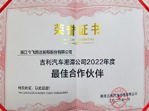 今飞凯达-吉利汽车湘潭公司2022年度最佳合作伙伴(荣誉证书)