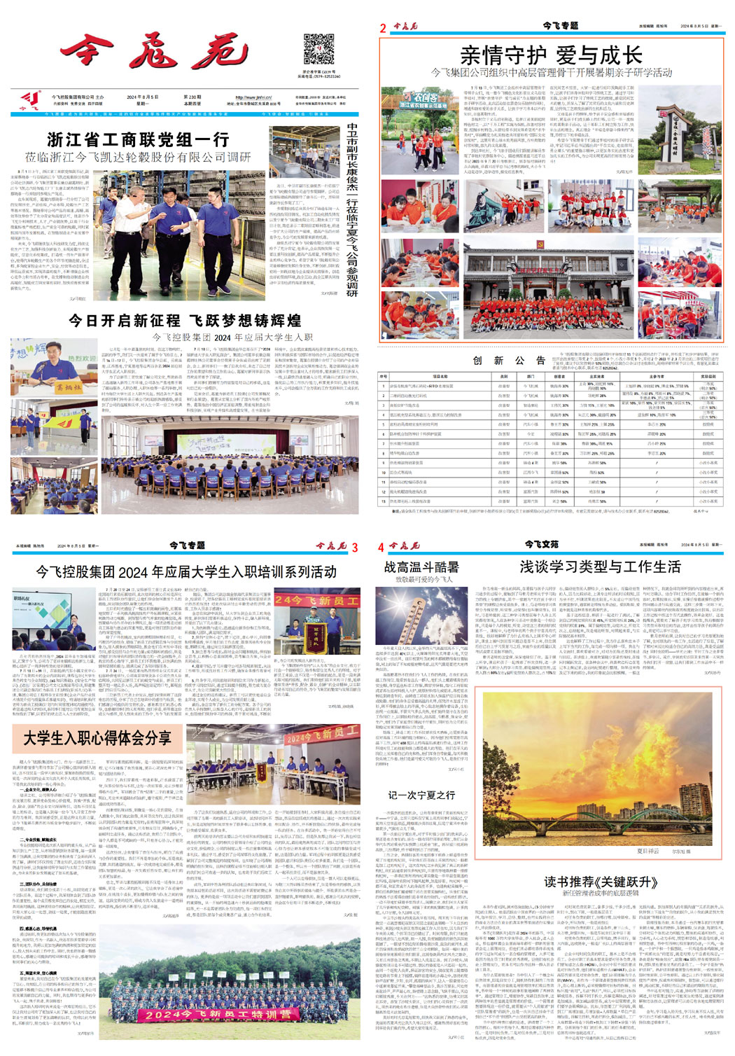 浙江省工商联党组一行莅临浙江今飞凯达轮毂股份有限公司调研今日开启新征程,飞跃梦想铸辉煌——今飞控股集团2024年应届大学生入职中卫市副市长康俊杰一行莅临宁夏今飞参观调研亲情守护 爱与成长丨今飞集团公司组织中高层管理骨干开展暑期亲子研学活动创 新 公 告今日开启新征程,飞跃梦想铸辉煌——今飞控股集团2024年应届大学生入职培训系列活动入职培训拓展心得心得体会读书推荐《关键跃升》新任管理者成事的底层逻辑战高温,斗酷暑——致敬最可爱的今飞人记一次宁夏之行浅谈学习类型与工作生活今飞控股集团新人培训心得体会