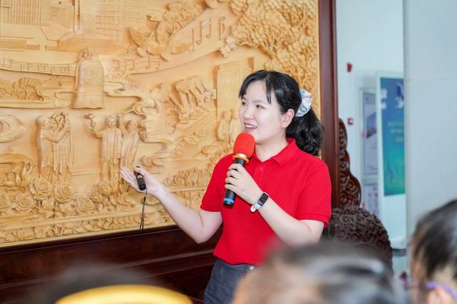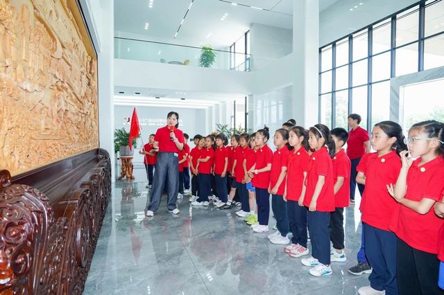 首先,今飞凯达副总经理兼董事会秘书葛茜芸带领孩子们来到了办公楼大厅木雕屏风前,做了屏风介绍:这座屏风记载了今飞发展史,它以今飞《飞翔之歌》为主线,以今飞重要历史瞬间,贯穿全屏,诉说了今飞坚守实体制造业66年艰苦创业、奋力拼搏的励志故事。这座屏风把老一辈今飞人艰苦创业,始终秉承实业强国的精神,创造一个又一个奇迹的故事篆刻得栩栩如生,也把新一代今飞人接力前行,跟随社会发展的脚步,经过改制以后二十多年的跨越式发展刻画得淋漓尽致。看着这座屏风上的每一个人物雕刻,听着葛总的娓娓道来,孩子们若有所思,深受震撼,觉得今飞的创业者很不容易,很了不起,纷纷为他们的坚守点赞。