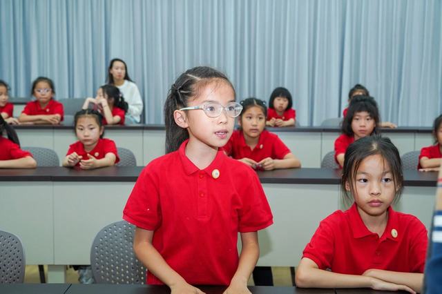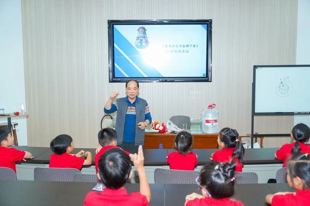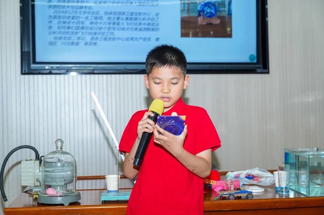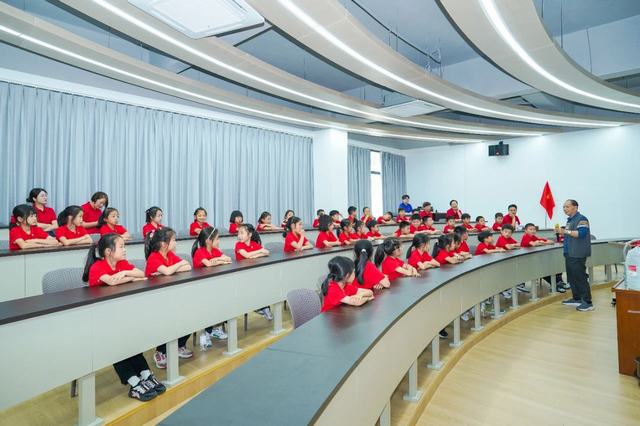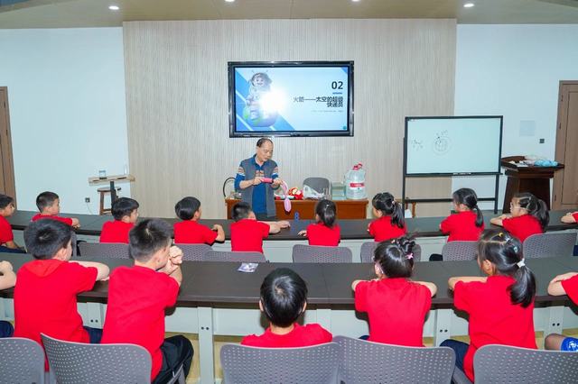 现场参观结束后,孩子们们来到企业文化中心阶梯教室参加名师讲课。此次活动集团特别邀请金华一中退休教师陈保平老师开展“飞向太空奇妙之旅”主题讲座。陈老师深耕物理教学四十余年,曾任金华一中物理教研组长,培养出上百位博士/博士后人才,执掌金外三届创新班教学,系学科带头人。现受聘火箭军授课,助力士官考取解放军火箭工程大学。讲座开始前,先由金华师范附属小学杜葛瑾同学分享了今年四月同爸爸妈妈一起受邀请去酒泉东风航天城,观看神舟二十号载人火箭发射的精彩故事。杜同学描述生动并且用一张张照片向同学们耐心讲解这次难忘的旅行,其中最为激动的是亲眼看见火箭升天的壮观景象。火箭直冲云霄,作为新一代的少年,内心沸腾,久久不能平静,自豪感油然而生,心中满是对航天员的崇敬与祝福。